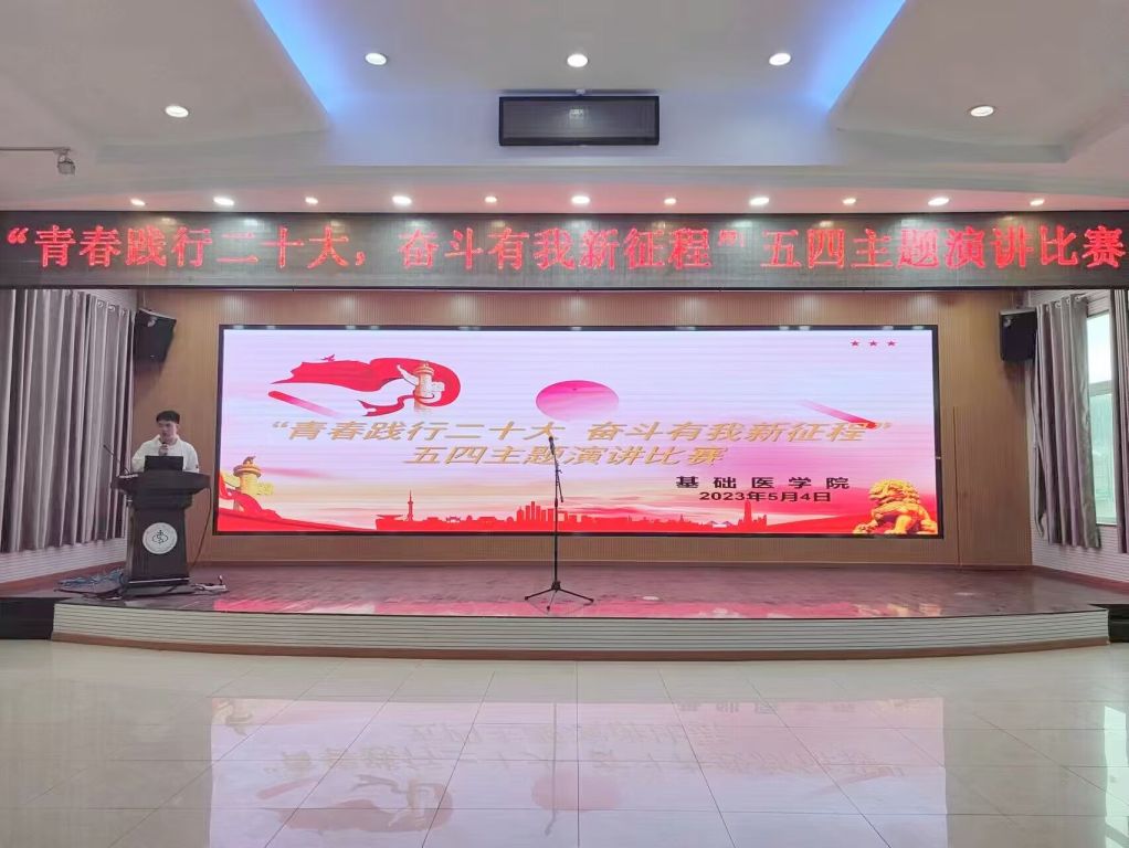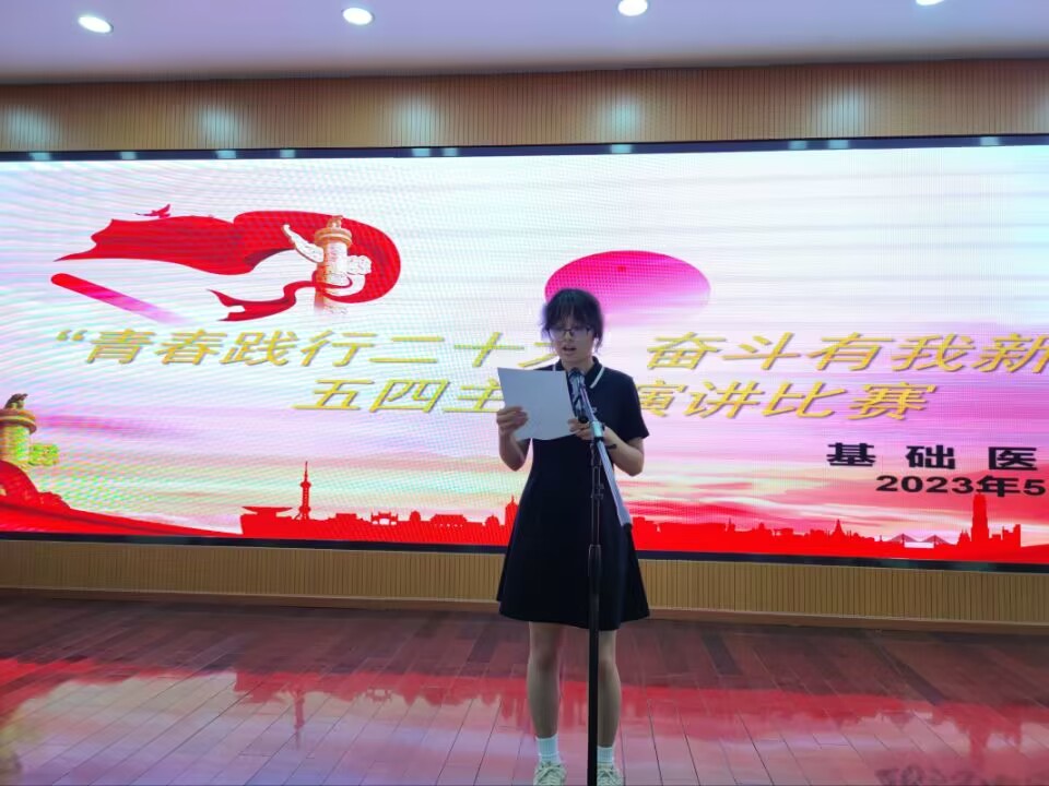 比赛在主持人慷慨激昂的开场白后正式拉开帷幕,9位参赛选手在演讲中不仅回顾了五四运动的历史事件,还结合个人实际情况抒发爱国情感,将个人成长融入祖国发展、民族复兴。来自药护2022临本6班的廖杨同学以“穿越时空”的方式,把革命英雄与当代青年做对比,激励广大青年学子汲取“五四”力量,坚定理想信念,践行青春使命。来自2022生物医学科学班的杨培琼同学以“以青春担使命,尽责任展风采”为主题,号召青年员工用青春与热血肩负时代使命、勇毅前行,一句句铿锵有力的“请党放心,强国有我”引起全场员工共鸣!