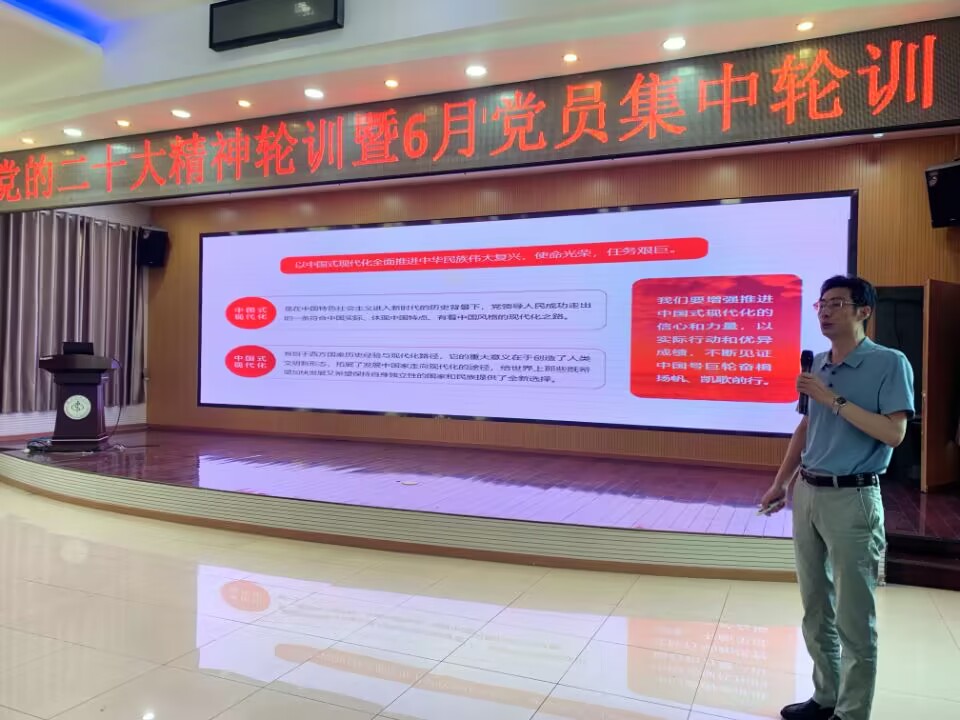 王配军以《坚持以中国式现代化全面推进中华民族伟大复兴》为题,围绕中国共产党的百年历史,从二十大报告中指出中国式现代化道路是实现中华民族伟大复兴的必由之路,提出实现中国式现代化,必须深刻把握中国式现代化的科学内涵和本质要求、始终坚持将高质量发展作为实现目标的金钥匙、始终保持新时代踔厉奋发勇毅前行的精神状态。