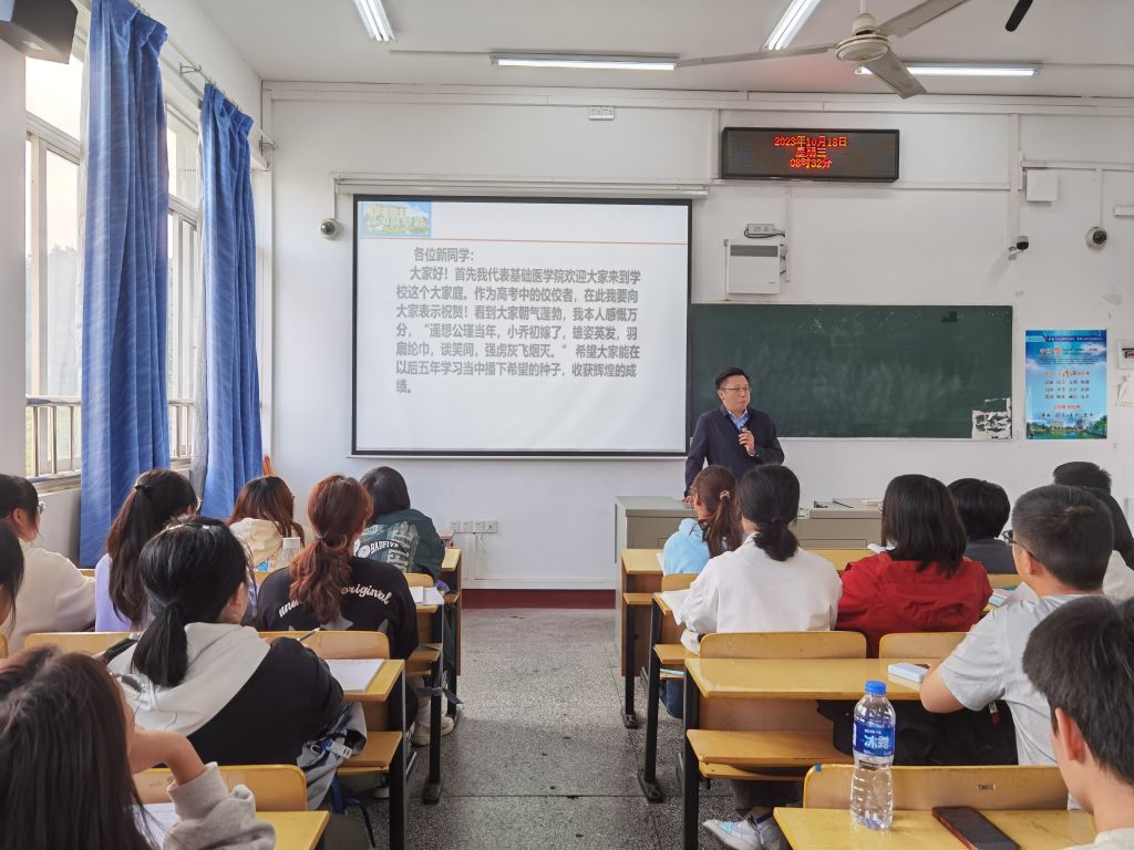付勇首先介绍了公司的基本概况,引出“如何读大学”让新同学们去思考,然后从临床医学的专业特点、培养目标、培养要求、课程学习等方面进行详细介绍,阐述了临床医学专业员工应具备的知识和能力。他强调培养自主学习的重要性,传授了“七种学习心态”、“七大学习能力”的秘诀。最后,付勇结合自身求学和扶贫工作感悟,将宝贵的个人经验告诉大家,激励同学们为自己理想中的职业生涯而努力奋斗、勤奋学习。