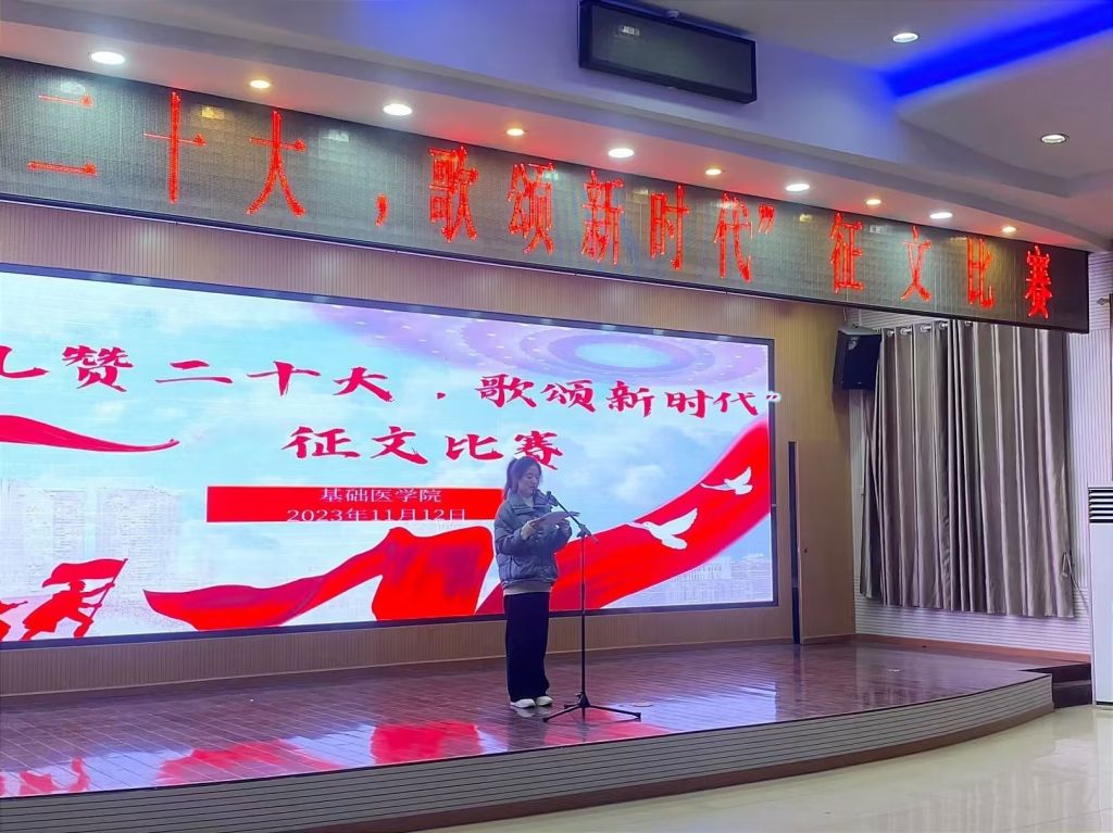 在决赛中,八名参赛选手以朗诵的形式与同学们分享征文,他们从中国发展史中领会党的二十大精神,结合新时代的发展趋势,表达自身奋发进取的决心。荣获比赛一等奖的是22生物医学科学班的龚铭同学,她以“学习党的二十大精神,绽放绚丽的青春之花”为主题,强调将党的二十大精神内化于心、外化于行,激励同学们打好基础,勇毅前行! 荣获比赛二等奖是23生物医学科学班的陈元奇同学,他以“弘扬党的二十大精神,踔厉奋发向未来” 为主题,呼吁同学们以优秀品质塑造自己,追求卓越;同时获得二等奖的还有药护23临本6班的胡函绮同学,她以“青年当有为,献礼二十大”为主题,表达斗志:吾辈青年更当着眼未来,做有理想、敢担当、能吃苦、肯奋斗的新时代向上好青年,踵事增华,不负韶华!荣获比赛三等奖是药护22临本6班的廖杨同学,她以“牢记新时代使命,不负青春之华章”为主题 ,鼓舞同学们扛起青年使命,用青春燃烧红光;同时获得三等奖的还有药护22临本6班的李诗怡同学,她以“吾辈青年与时偕行,终日乾乾助恒昌”为主题,号召青年人心系天下,脚踏厚土,让本领在实践中获得磨砺,让理想在初心中生根发芽!