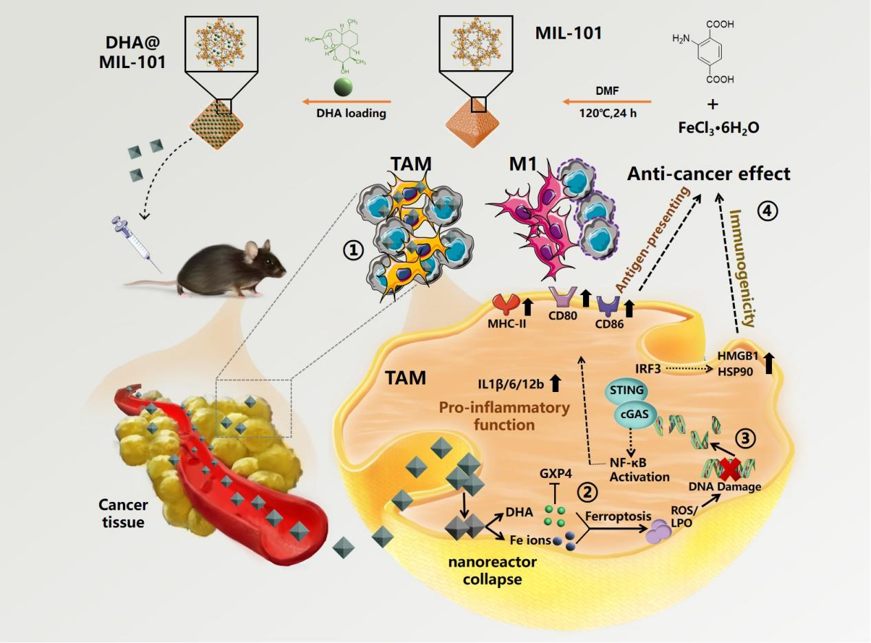 肿瘤微环境中浸润着大量肿瘤相关巨噬细胞(TAM),以免疫抑制的M2表型为主。由于免疫微环境的抑制促进了肿瘤的快速进展,导致疗效不佳、预后不良。天然药物双氢青蒿素(DHA)具有经济、低毒、应用范围广等优势。本团队前期发现DHA可重塑TAM为M1型。为进一步增强其靶向性及改善水溶性、提高效价强度,团队构建了DHA纳米制剂(DHA@MIL-101)。研究发现DHA@MIL-101可被免疫微环境中的巨噬细胞摄取,通过GPX4抑制和铁离子释放两者的协同效应快速引发铁死亡,产生的LPO损伤 DNA,其片段介导 cGAS/STING 激活,通过NF-κB诱导的炎症和 IRF3引起的免疫原性,重编程TAM为MI型,介导抗肿瘤免疫应答。对天然药物纳米制剂的系统研究有助于推动医药创新和转型升级,对研发新药及开发新药剂有重要意义。