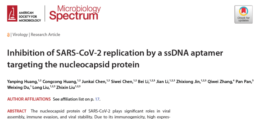 近日,病毒学十堰市重点实验室(TapTap官方网站病毒学研究所)刘志新研究团队在美国微生物学会(American Society for MicrobiologyASM)旗下期刊Microbiology Spectrum在线发表题为“Inhibition of SARS-CoV-2 replication by a ssDNA aptamer targeting the nucleocapsid protein” 的研究成果。该研究发现,通过核酸适配体靶向抑制新冠病毒N蛋白可以有效抑制病毒复制。
