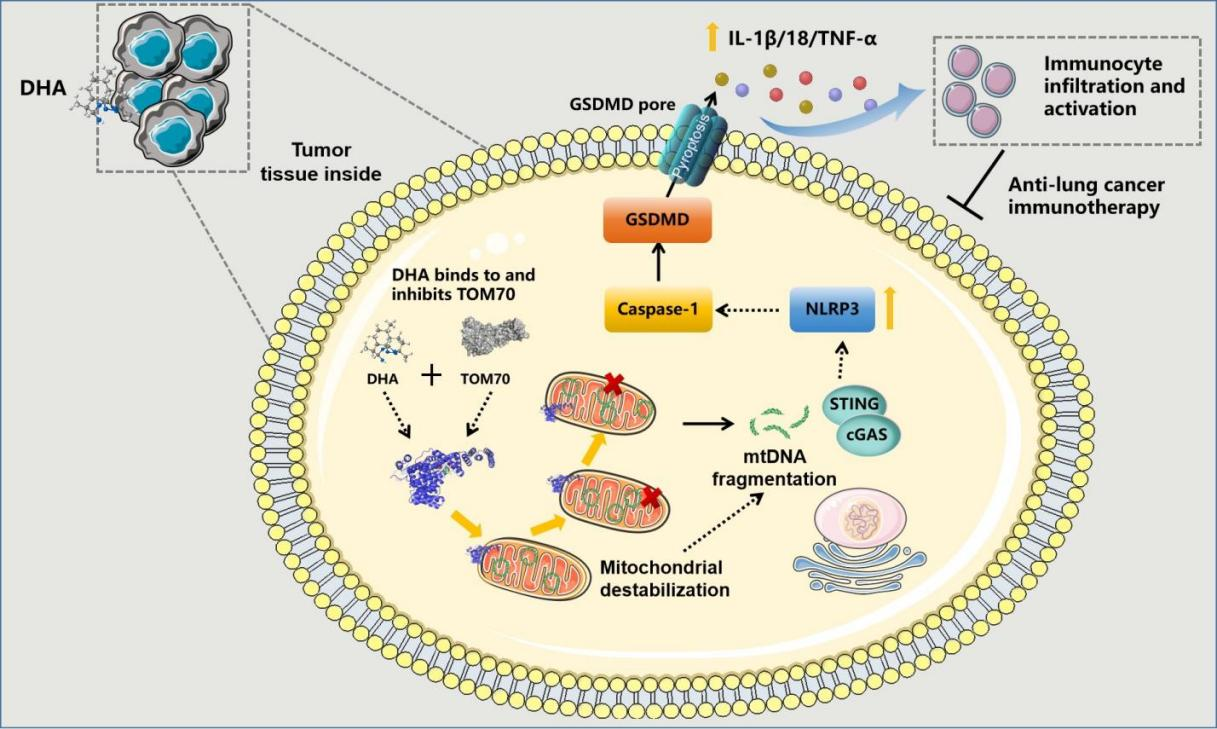 本网讯,(通讯员 李留根 张豪)青蒿素是我国自主研发的天然化疗药物,其特有的氧桥结构提示可能还有很多未被挖掘的药物靶点及药理作用。近日,天然药物纳米制剂研究十堰市重点实验室李童斐团队在药理学权威期刊Phytotherapy Research (中科院二区,IF: 7.2) 发表了题为Dihydroartemisinin-driven TOM70 inhibition leads to mitochondrial destabilization to induce pyroptosis against lung cancer”的研究成果。该工作发现双氢青蒿素能通过线粒体外膜蛋白TOM70干扰线粒体稳定性,驱动mtDNA转位至细胞质,被传感器cGAS捕获,从而激活STING/NLRP3,诱导肺癌细胞发生凋亡。该研究发现了双氢青蒿素调控肿瘤细胞线粒体功能的新靶标,这对于深入理解青蒿素的药效及开发抗肿瘤新药均有重要意义。