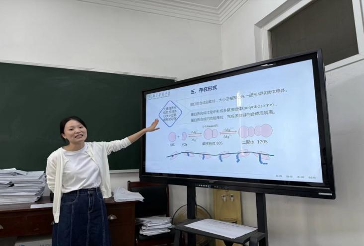 王娜围绕《细胞生物学》“核糖体” 章节开展20分钟试预讲,以调查问卷形式引入主题,随后从核糖体的基本特征、化学组成及存在方式展开讲授。其授课条理清晰、语言生动,结合直观易懂的图片将晦涩知识通俗化,展现出积极的精神风貌。